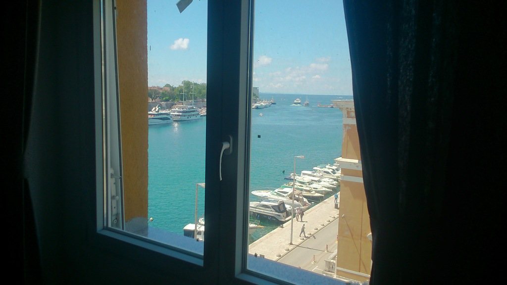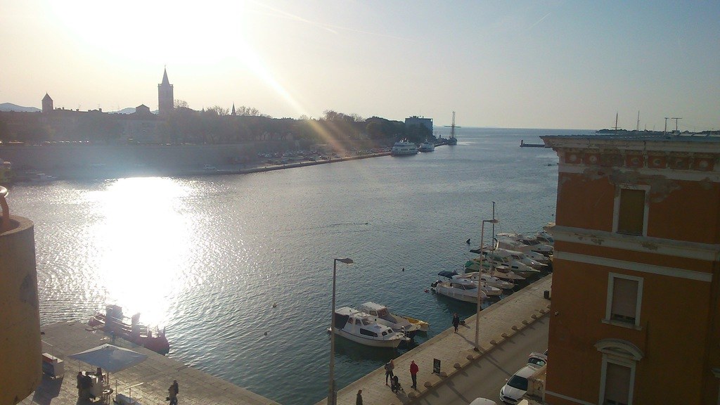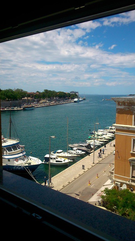 Vom Balkon hat man einen sensationellen Blick zum Meer, den Hafen und die Altstadt von Zadar.