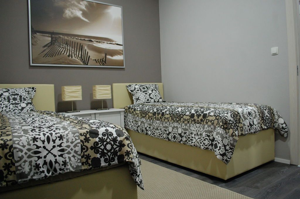 Ein Schlafzimmer mit Doppelbett und ein weiteres Schlafzimmer mit zwei Einzelbetten.